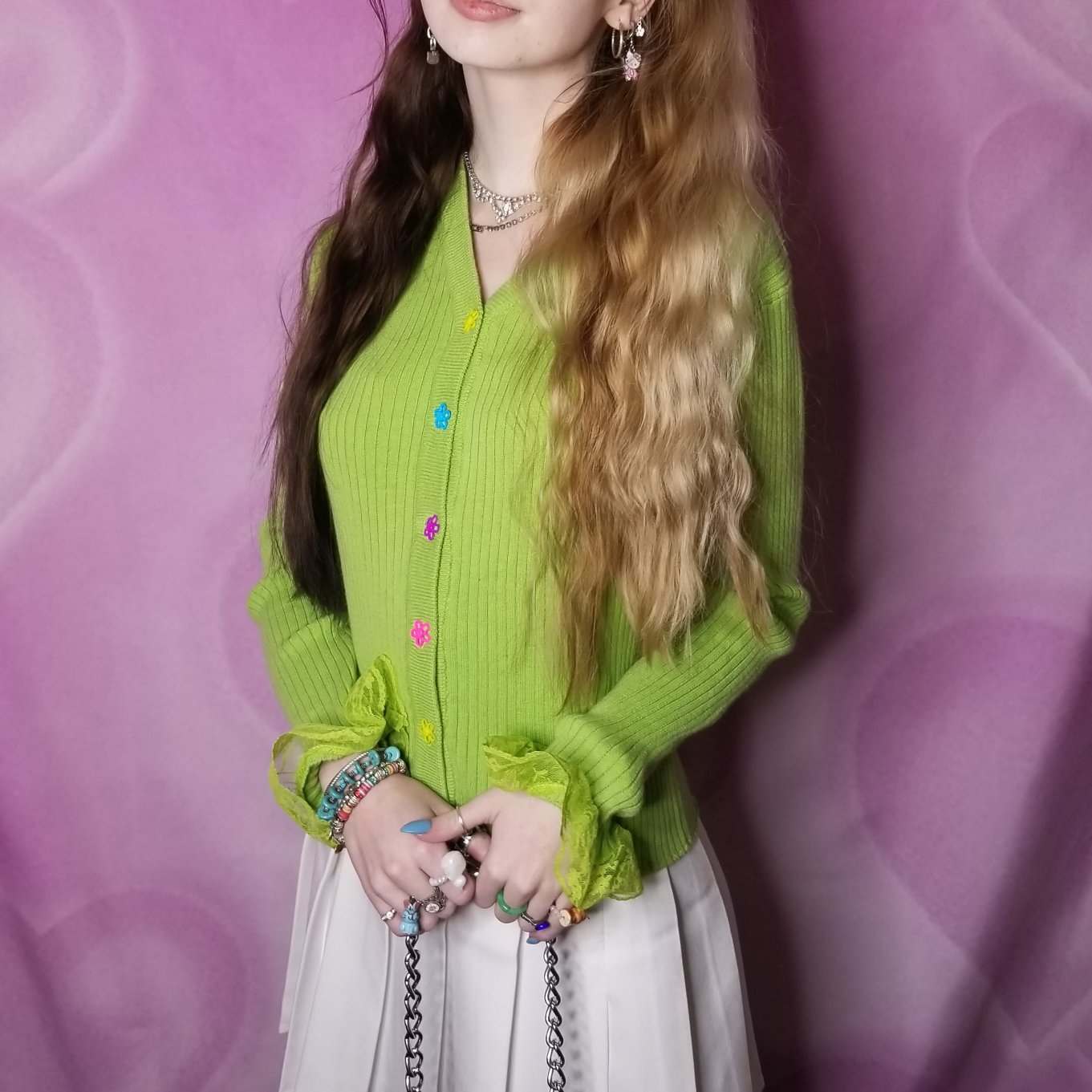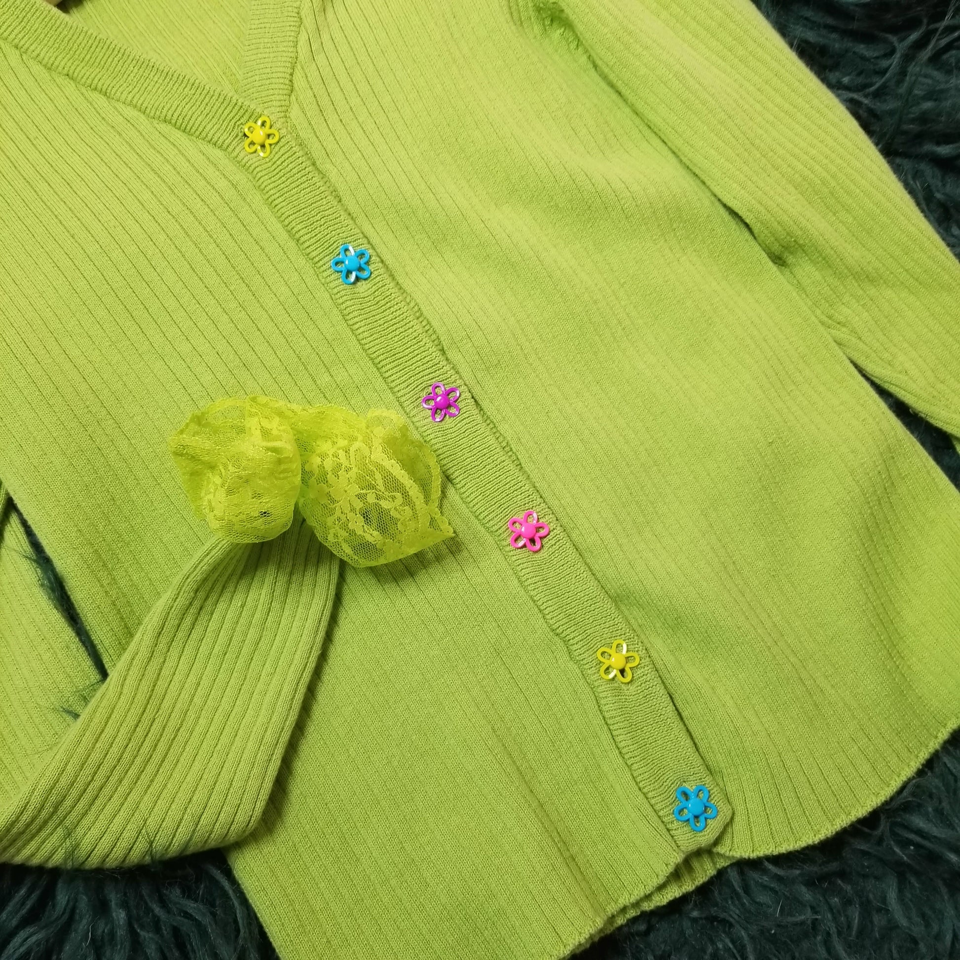 Hand sewn neon groovy flowers along the front with even more sauce on the sleeve, added lime green lace ruffle trim that's hard not to notice and obsess over.