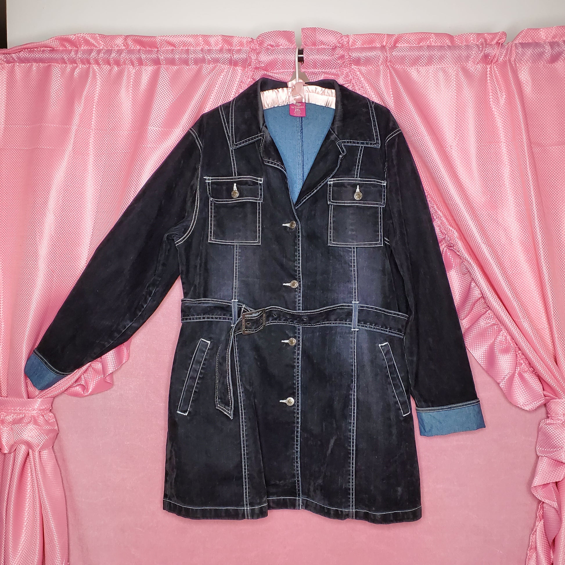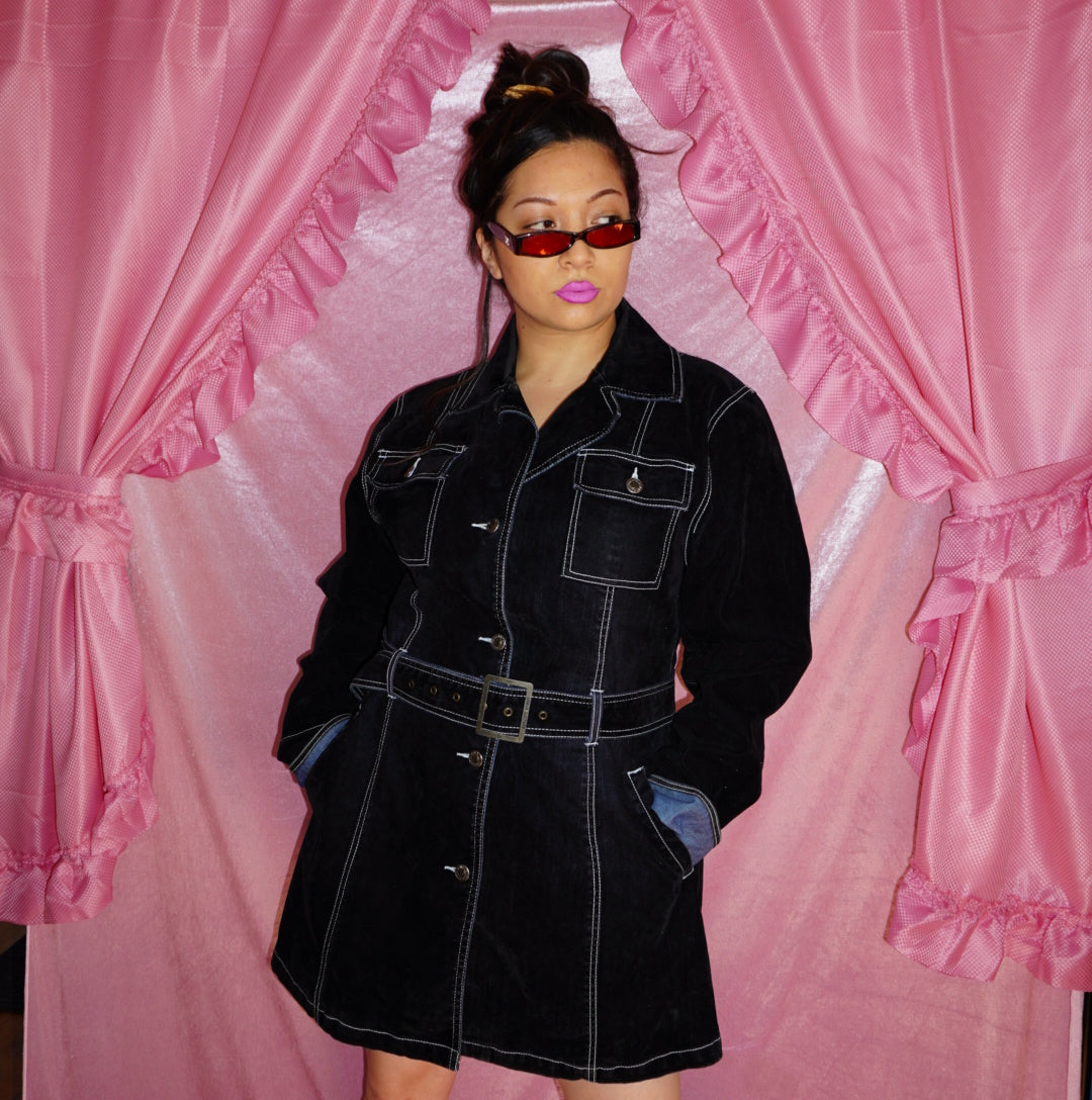 details: black with white contrast stitching and cute belt to cinch at the waist.