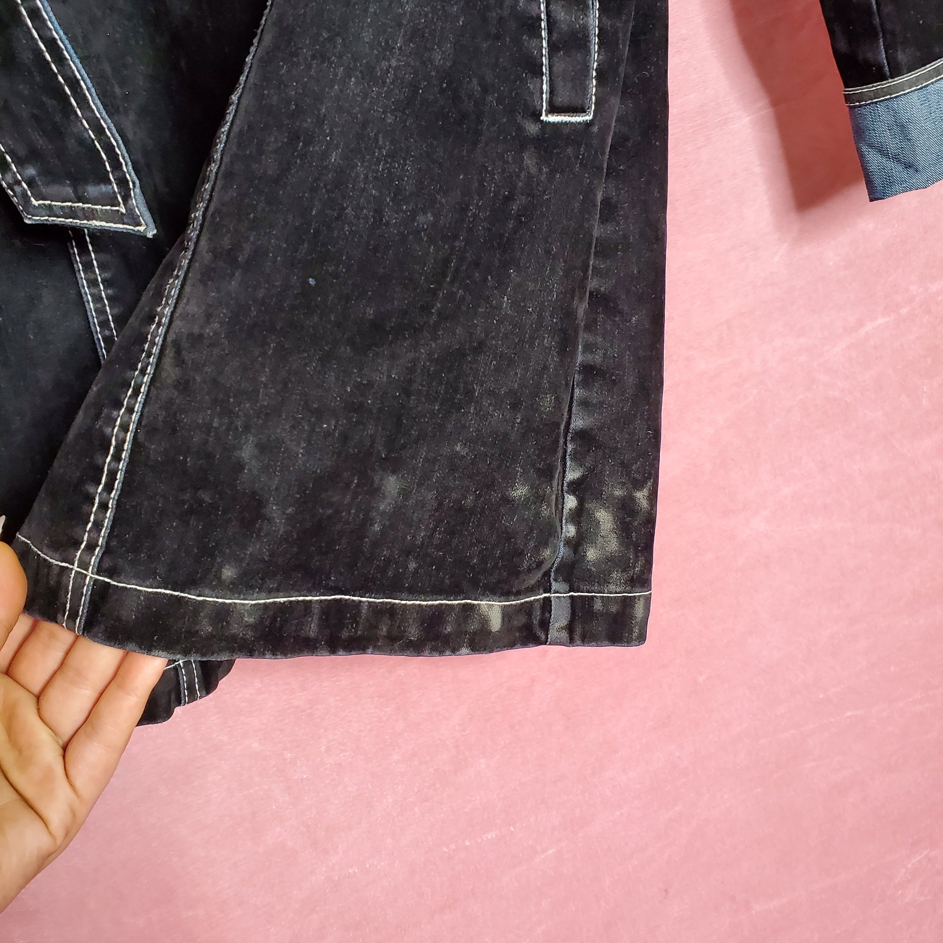 Flaws: fading and white spots on the hem and collar from previous wear