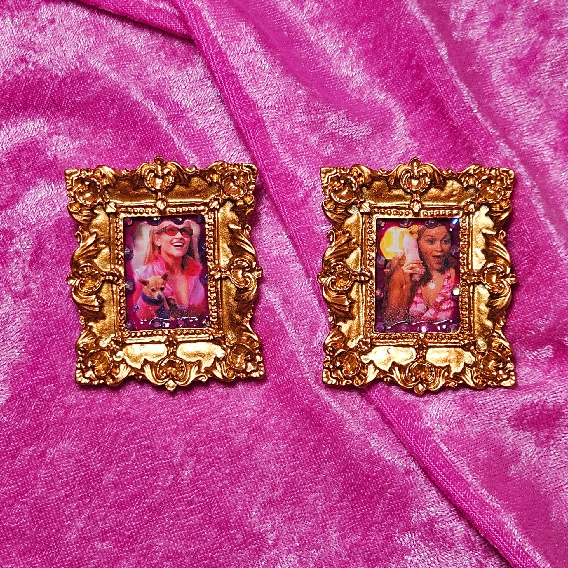 Photos from the legally blonde soundtrack enclosed in a gold baroque frame & embellished with puffpaint & rhinestones
