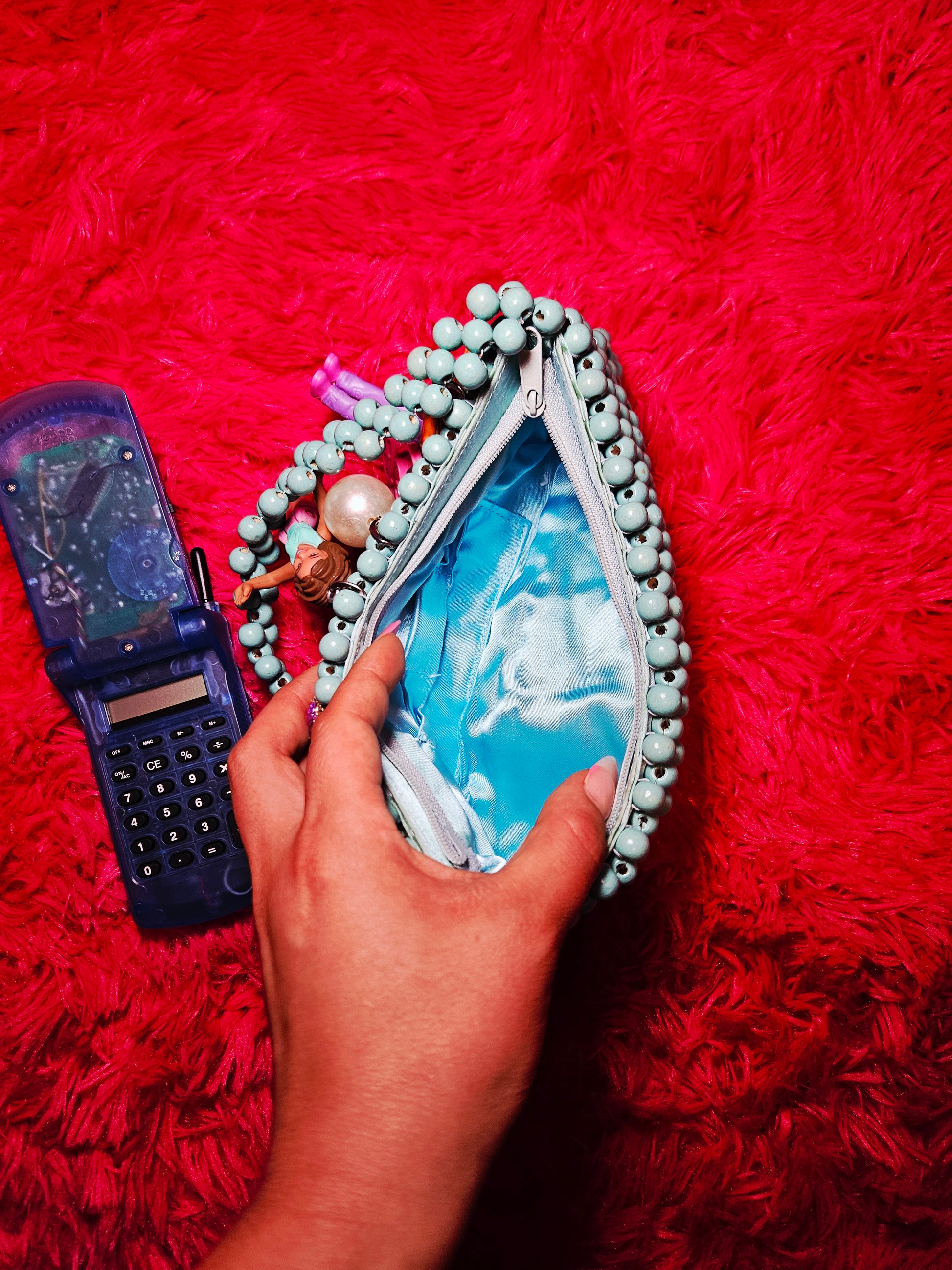 Using discarded toys & a vintage Robin's egg blue beaded mini bag