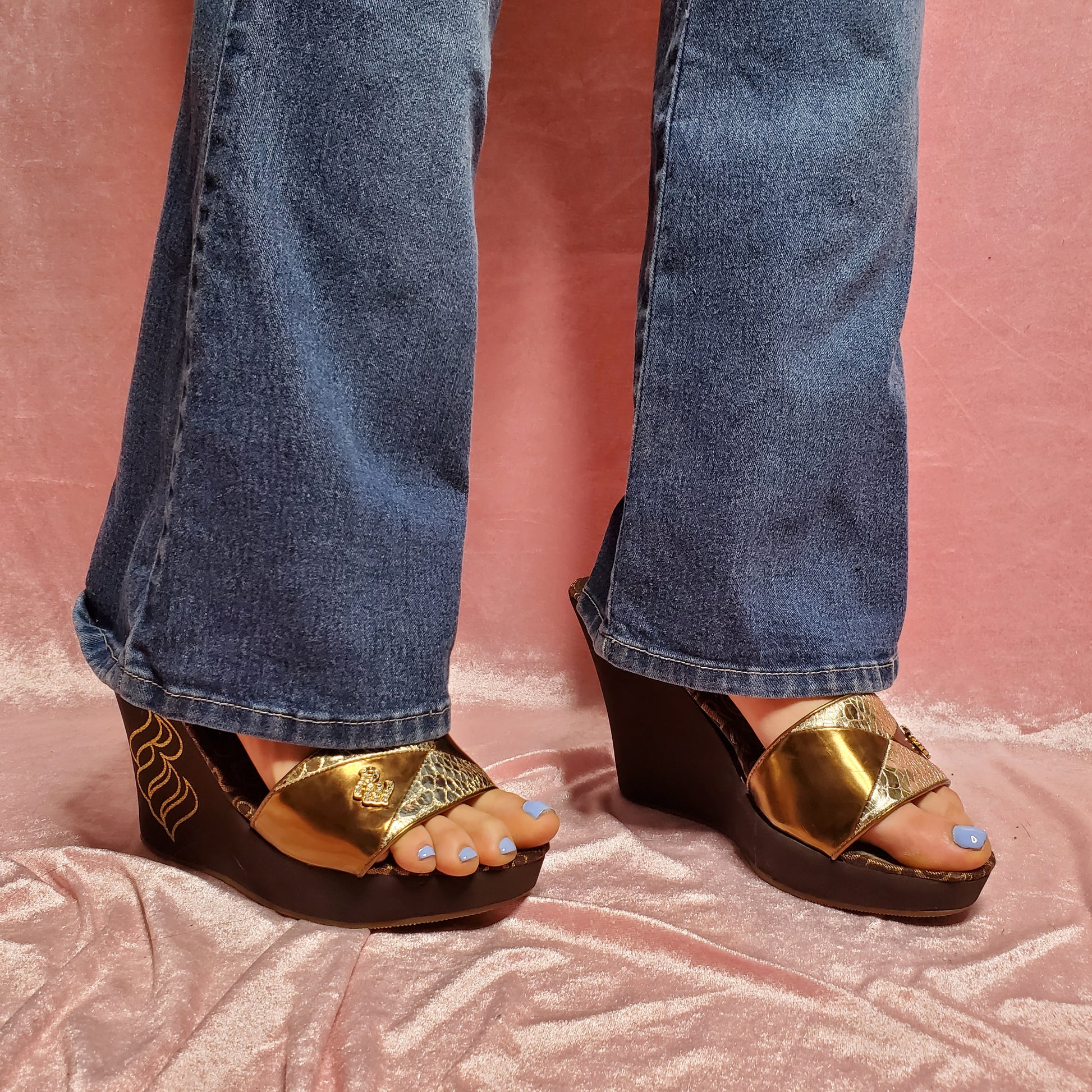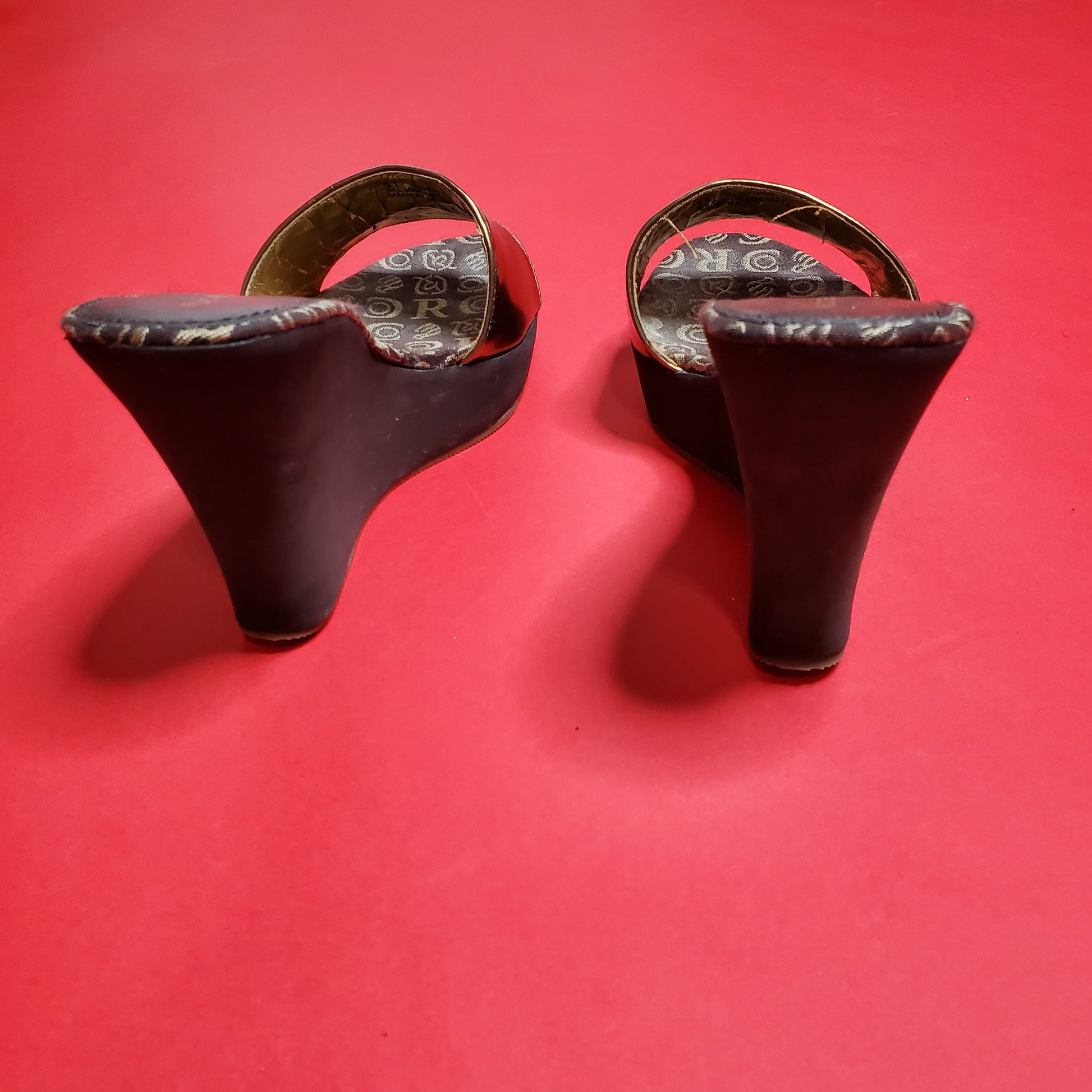 super cute Rocawear monogram print on the insole with bronze and gold detailing on the band